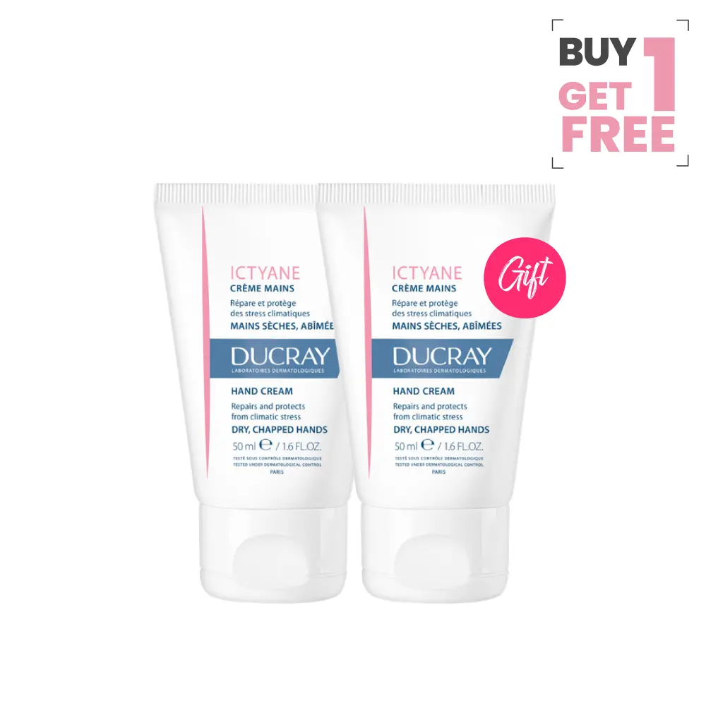 Ducray Ictyane Hand cream-50ML (Buy One Get One): Its unique thermo-protective TGS complex, combined with Shea Butter, helps restore the damaged epidermis. Its innovative texture allows for easy application and rapid absorption, with an invisible, non-greasy finish.