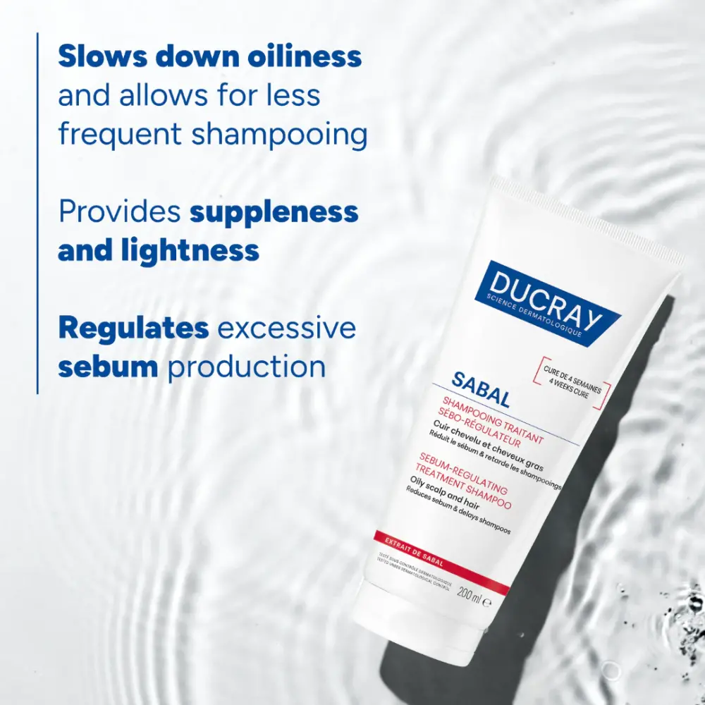 Ducray Sabal Sebum Regulating Treatment Shampoo for Oily Hair is an intensive care solution for oily scalps and hair. Dermatologically tested, it cleanses effectively while respecting the scalp’s natural balance. Formulated with a concentrated extract of Sabal serrulata, a proven anti-seborrheic active ingredient, it helps regulate and reduce excess sebum at the source. The result is a purified scalp with roots that feel fresh, light, and less greasy.