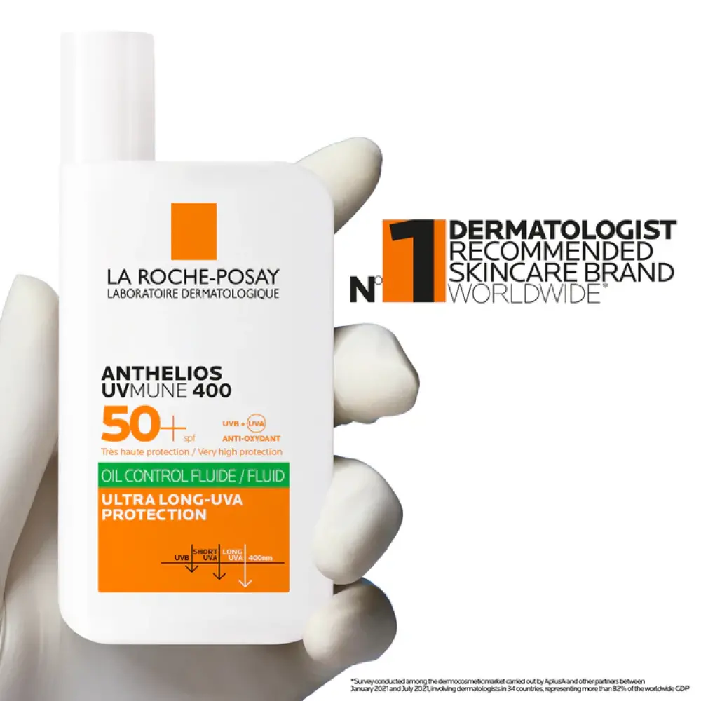 La roche-posay anthelios uvmune 400 oil control fluid spf50+ offers advanced sun protection specifically designed for oily and acne-prone skin. With the most advanced uv filter (mexoryl 400), it provides ultra-long uva and uvb protection while helping to reduce excess shine and prevent sun-induced breakouts. Its lightweight, non-greasy texture absorbs quickly and leaves a matte finish, making it ideal for daily use, even under makeup.