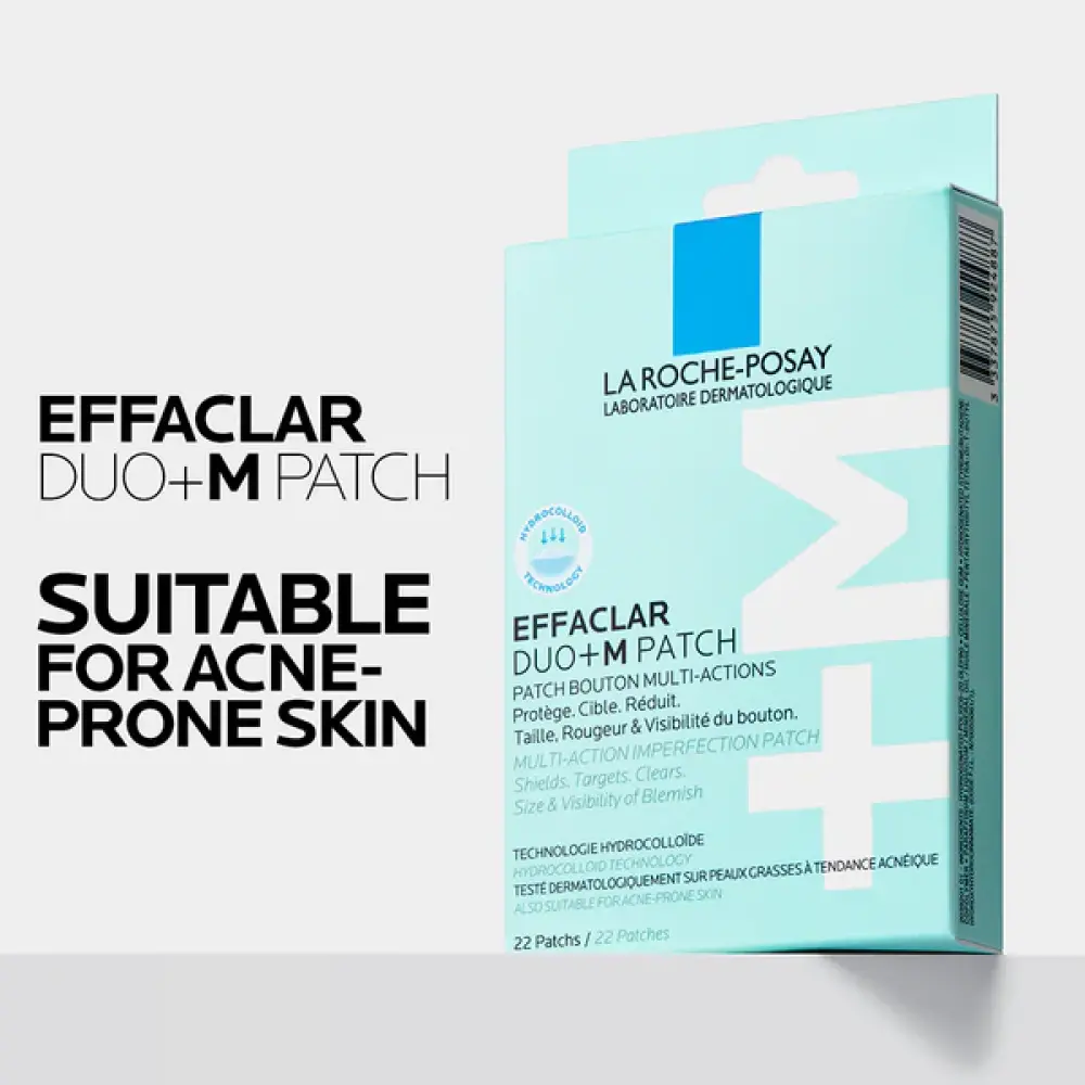 La roche posay effaclar duo+m 3h spot patches for acne prone skin by forming a shield around blemishes, the single-use pimple patches pull out impurities while keeping moisture balanced. With 420µm hydrocolloid technology, they enable effective absorption and support spot healing. Pack of 22 units. Available in two sizes: 12 small patches, 10 medium patches.