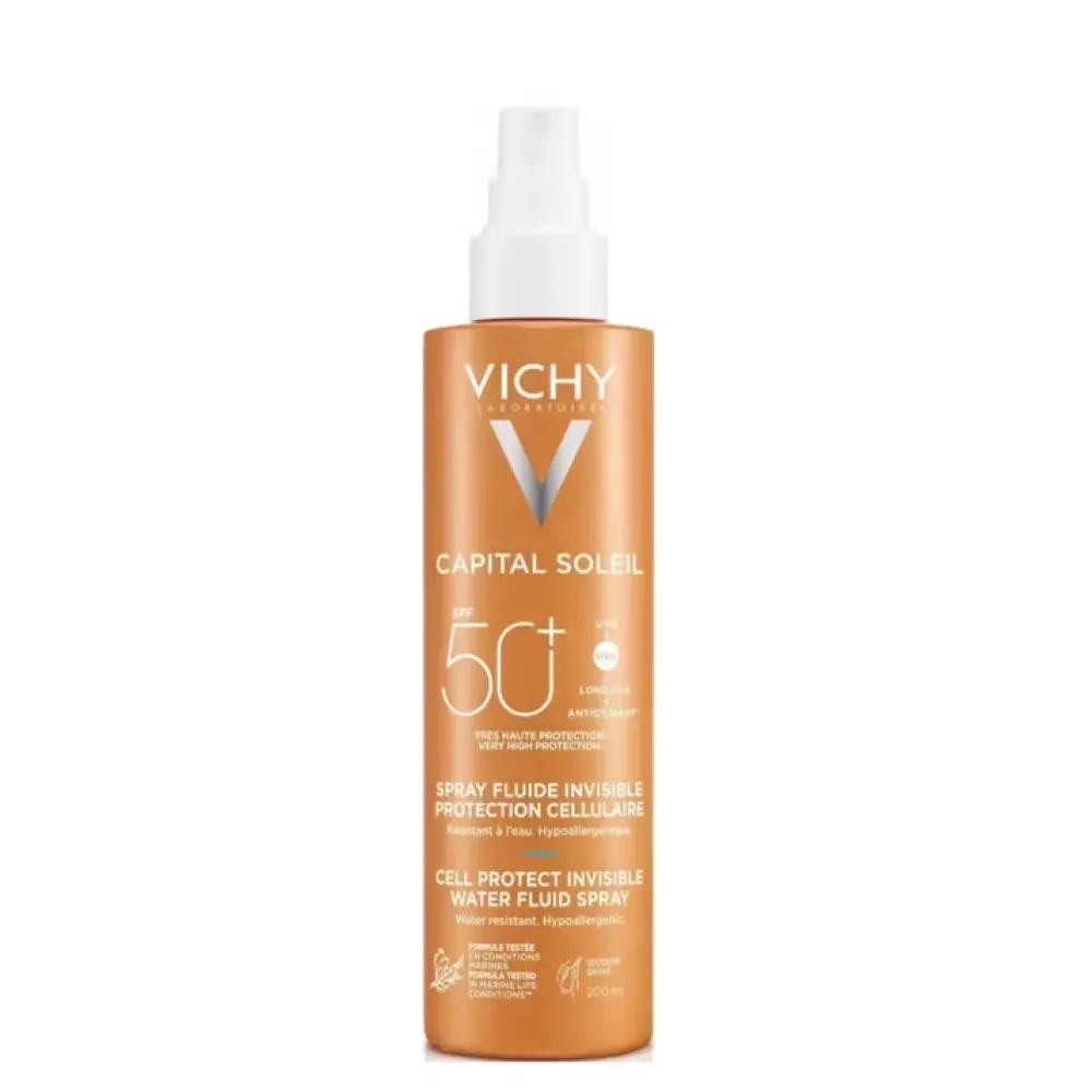 Vichy capital soleil cell protect invisible water fluid spray spf50 offers uvb, uva, long uva and antioxidant sun protection keeping the skin's protective barrier more repaired and reinforced.