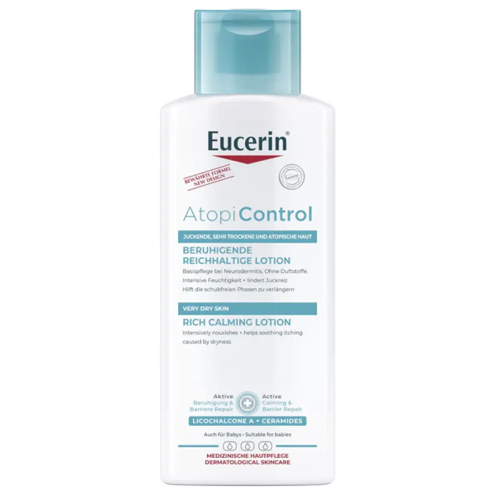 Eucerin atopicontrol rich calming body lotion is an easily absorbed and water-in-oil lotion that helps hydrate, soothe and reduce skin discomfort and dryness caused by atopic dermatitis. Its rich formula contains essential ingredients that ease itchy and dry skin. Licochalcone a actively soothes and calms inflammations, natural omega oils help stabilize skin’s natural protective barrier, and ceramides strengthen skin’s barrier to prevent moisture loss.